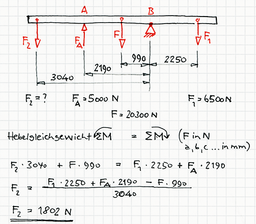 (Lösung: Die Achskraft FB ist 1417,7 daN; FA = 2250 daN – 1417,7 daN = 832,3 daN).