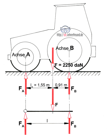Berechnen Sie für den Schlepper zur Abwechslung FB zuerst. Dazu müssen Sie den Drehpunkt in die Achse A legen. (Vorsicht: Von den beiden eingetragenen Abständen taugt nur einer als Hebelarm. Der wirksame Hebelarm ist immer der (senkrechte) Abstand zwischen der Kraft und dem Drehpunkt).