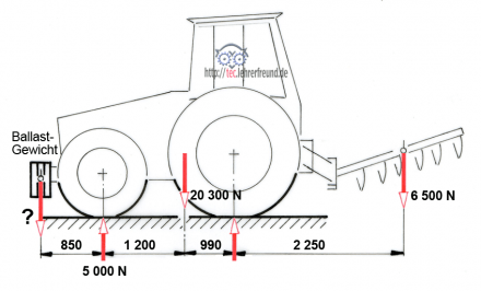 Hierzu eine weitere Aufgabe (Skizze unten): Wieviel Ballastgewicht muss aufgesetzt werden, wenn die Vorderreifen mit wenigstens 5 000 N auf den Boden drücken sollen? (Lösung: F Ballast = 1 802 N)