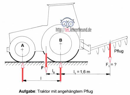 Aufgabe 2: Wir erweitern unseren Schlepper aus Aufgabe 1 um ein Anbaugerät, z. B. einen Pflug. Wir wollen herausfinden, bei welchem Pfluggewicht F1 der Schlepper um die Hinterräder (Achse B) zu kippen beginnt. Überlegen Sie bitte zunächst, wie sich die Achsbelastungen FA und FB durch die zusätzliche Kraft F1 ändern.