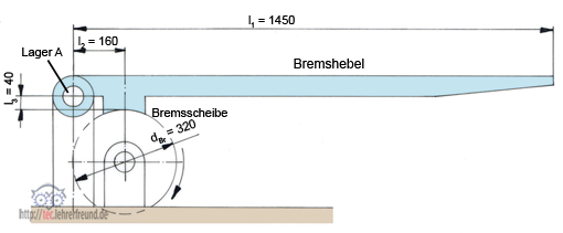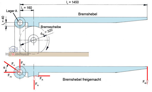 Der Bremshebel soll an der Scheibe mit dem Durchmesser 320 mm ein Bremsmoment von 2,5 kNm abbremsen. Die Reibzahl zwischen Bremsbelag und Bremsscheibe ist 0,45.