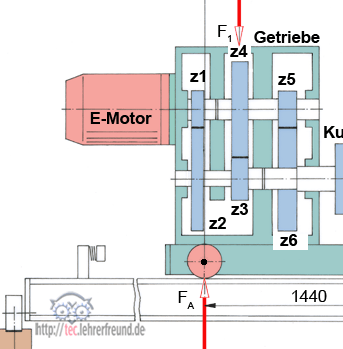In F1 = 5 500 N sind die anteiligen Gewichte von Motor, Getriebe und Kupplung zusammengefasst.