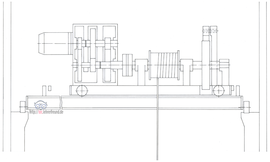 Das Bild zeigt die stark vereinfachte Konstruktion eines Laufkrans, wie sie in Werkstätten und Fabrikhallen eingesetzt werden. Laufkrane bewegen sich auf den Schienen einer Hochbahn und lassen damit Arbeitsflächen am Boden frei. Der farbig dargestellte Teil des Krans ist die quer laufende Laufkatze mit Hubwerksantrieb, deren Kernbaugruppe eine Seilwinde ist. Sie wird von einem E-Motor über ein dreistufiges Getriebe angetrieben.