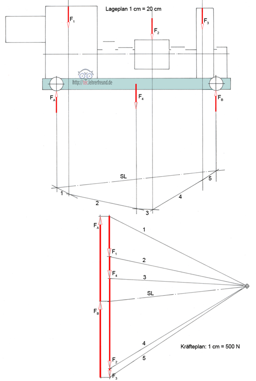 Die Lagerkräfte FA und FB (für einen Träger) sind zeichnerisch zu bestimmen.