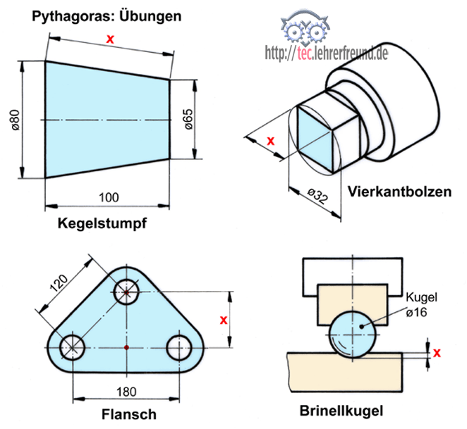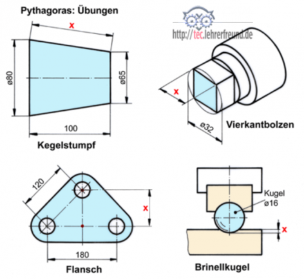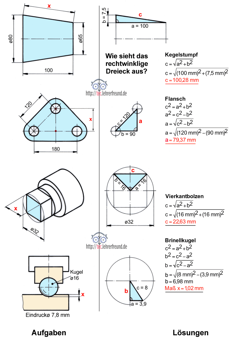 Der berühmte Satz des Pythagoras besagt: Die Summe der Flächeninhalte der Kathetenquadrate ist gleich dem Flächeninhalt des Hypotenusenquadrats. In der Technik gibt es unzählige Formen, deren Abmessungen sich mit diesem Satz berechnen lassen. Hier Erläuterungen und ausgewählte Beispiele.