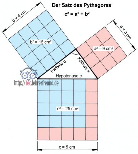 Ein besonderes rechtwinkliges Dreieck ist das mit glatten Seitenlängen, die man sich gut merken kann: 3, 4 und 5 cm. Die farbigen und gerasterten Quadrate bestätigen augenscheinlich die Richtigkeit des Satzes.