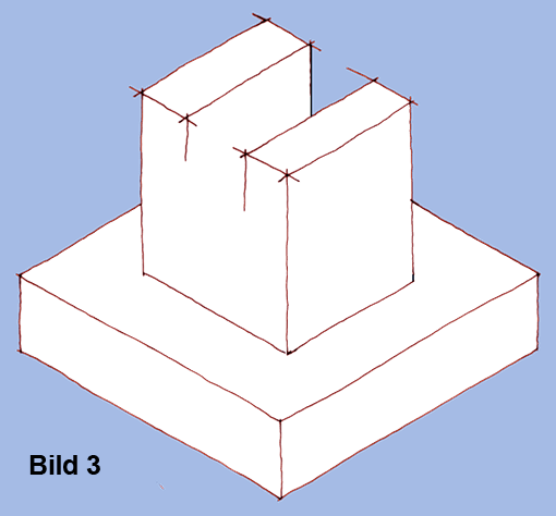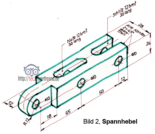 2.3 Zeichnen Sie die Spannpratze in isometrischer Perspektive. Beginnen Sie mit der unteren Platte und dem Einhängeklotz, wie in der Skizze Bild 3 dargestellt.