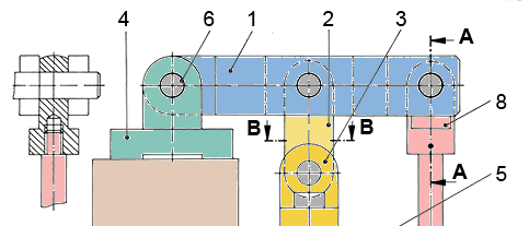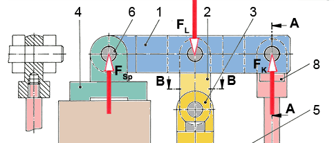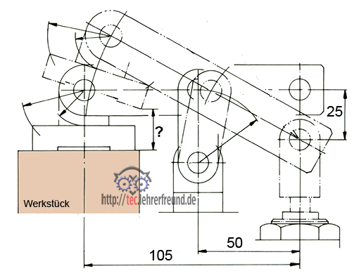 Aufgabe 4: Positionen des Spannhebels und der Spannpratze zeichnerisch ermitteln, wenn der Kolben des Hydraulikzylinders eingefahren ist.