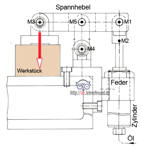 Der einseitig wirkende, senkrecht stehende Hydraulikzylinder betätigt den Spannhebel. Das Drucköl fließt von unten in den Zylinder (Pfeil). Zurückgeholt wird der Kolben durch Federdruck. Beim Einfahren bewegt sich der Spannhebel von M1 nach M2.