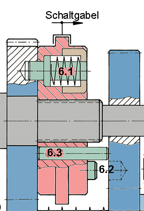 2. Beschreiben Sie die Abläufe der Kraftflüsse in beiden Gängen. Welche Funktion haben die Teile 6.1, 6.2 und 6.3 (Bild unten)? Wozu braucht man die Feder 10 und den Ring 11?