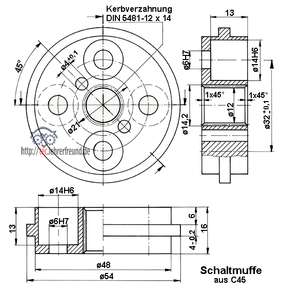 In die Bohrungen ø14 werden Buchsen gepresst; ihr Durchmesser 14p6. Berechnen Sie die beim Einpressen vorhandenen Übermaße, wenn die Bohrung in der Schaltmuffe mit H6 gefertigt wird.