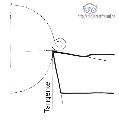 Das oben für geradlinig abgetrennte Späne Gesagte (Meißeln, Feilen, Sägen) gilt auch für die Herstellung zylindrischer Werkstücke. Die Winkelbasis bei diesen ist eine durch die Schneidenspitze laufende Tangente. Beispiel: Drehen.