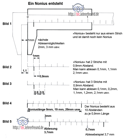 Wir erarbeiten einen Zehntel-Millimeter-Nonius, auch wenn wir ahnen, dass der mechanische Messschieber in zwanzig Jahren wohl nur noch auf Antiquitätenmärkten zu haben sein wird.