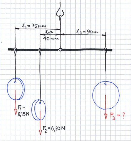 Hebel ist mittig aufgehängt. Fadengewichte nicht berücksichtigen. Berechnen Sie das Gewicht F3.