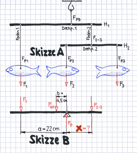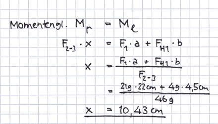 Ergebnis: Das System mit Hebel H2 und den Fischen 2 und 3 muss im Abstand x = 10,43 cm aufgehängt werden, damit Hebel H1 im Gleichgewicht ist.