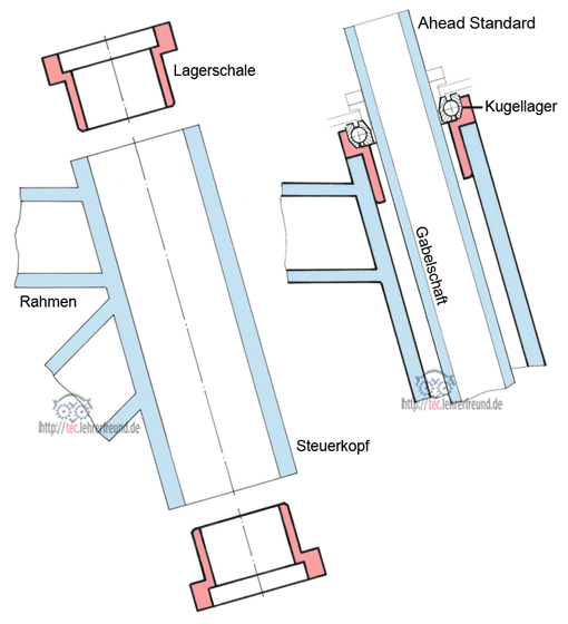 In das obere und untere Ende des Steuerrohrs werden Lagerschalen eingepresst. Die Wälzlager selbst liegen dann in den Lagerschalen außerhalb des Steuerrohrs.