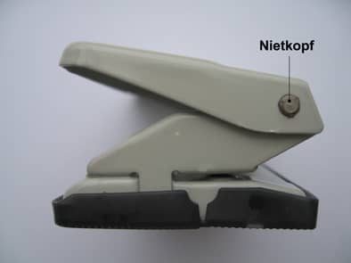 Der Lochhebel ist mit dem Locherkörper über eine vernietete Stange verbunden.