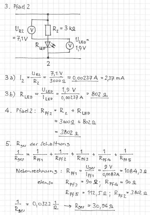 3.  Pfad 2: An der Leuchtdiode fallen 1,9 Volt ab. R2 = 3 kΩ.
