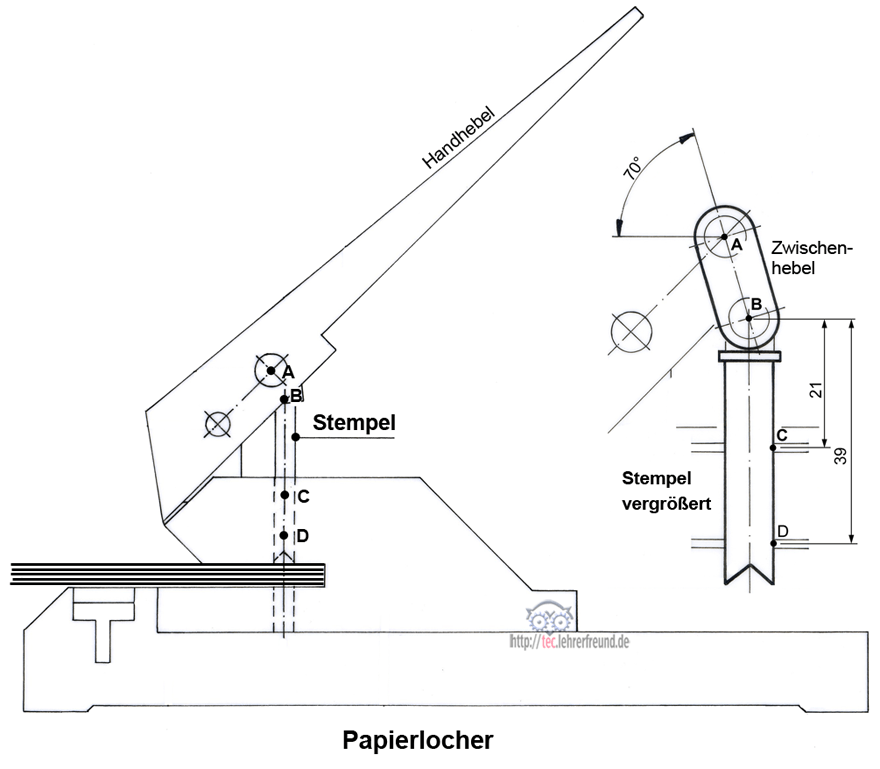 Der Handhebel übt am Gelenk A auf den Zwischenhebel eine Druckkraft aus. Diese drückt über FB den Lochstempel nach unten gegen den zu lochenden Papierstapel.
