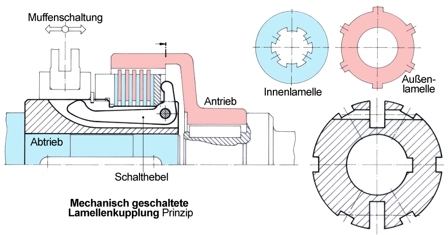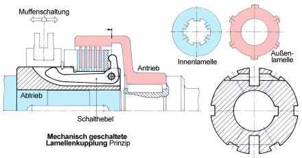 Ihre Funktion: Die sich drehende Antriebsseite (rot) nimmt bei Bedarf durch Schalten die stehende Abtriebsseite (blau) mit. Die Verbindung der beiden Seiten wird mit einer ringförmigen Schaltmuffe eingeleitet. Sie steht in der Ausgangslage ganz links. Wird die Schaltmuffe nach rechts geschoben, dann läuft sie auf den aus seiner Nute etwas herausstehenden Schalthebel auf. Dabei drückt sie über eine schräge Fläche den Winkelhebel nach unten. Gleichzeitig wird über die zweite, senkrechte Nase rechts das Lamellenpaket zusammengepresst. Durch Reibschluss wird die Abtriebsseite allmählich mitgenommen.