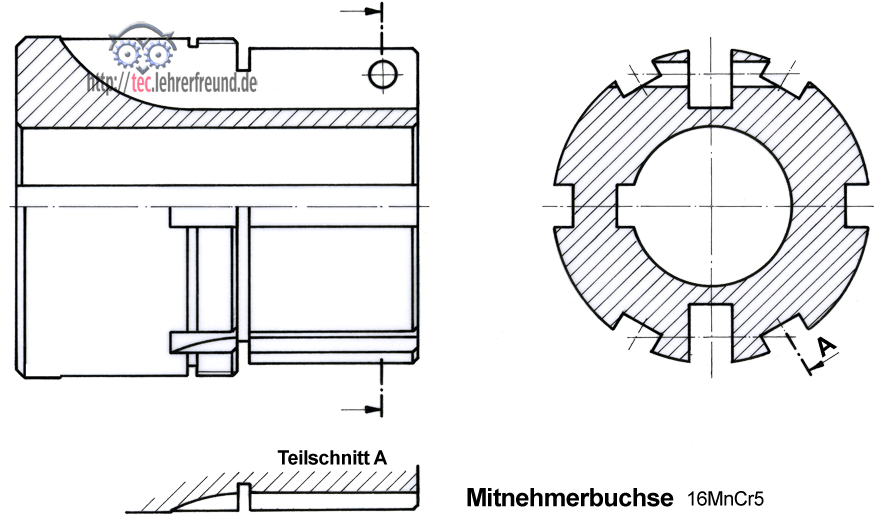In der Übung geht es um zwei Teile einer Lamellenkupplung: Mitnehmerbuchse und Schalthebel. In vorbereiteten Zeichnungen sind Passungskurzzeichen und Oberflächensymbole zu setzen.