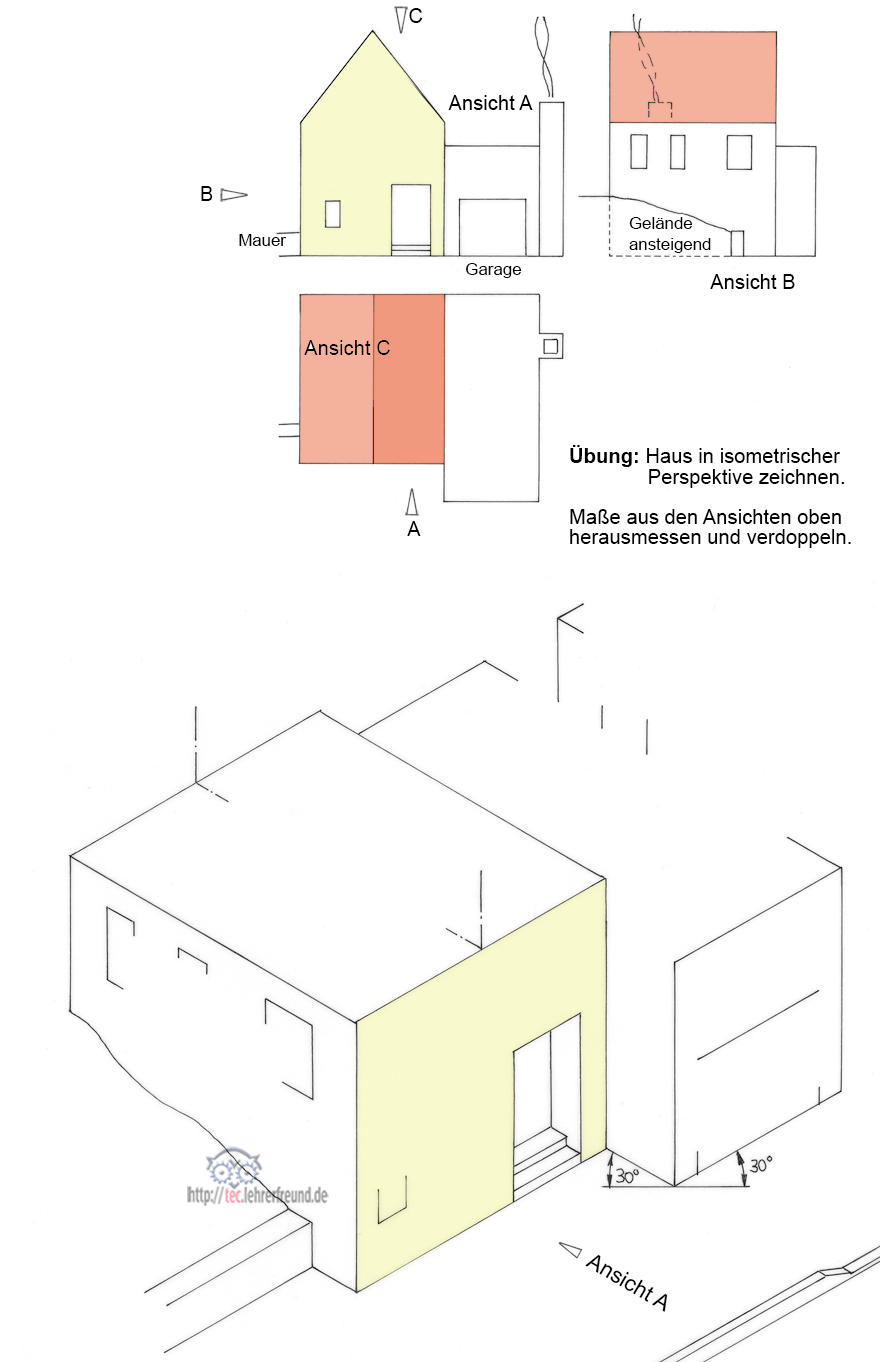Das in 3 Ansichten gezeichnete Gebäude (oberes Bild) soll in isometrischer Perspektive gezeichnet werden.