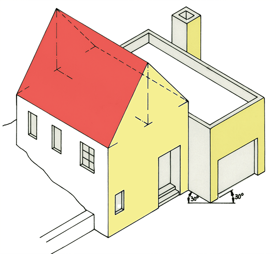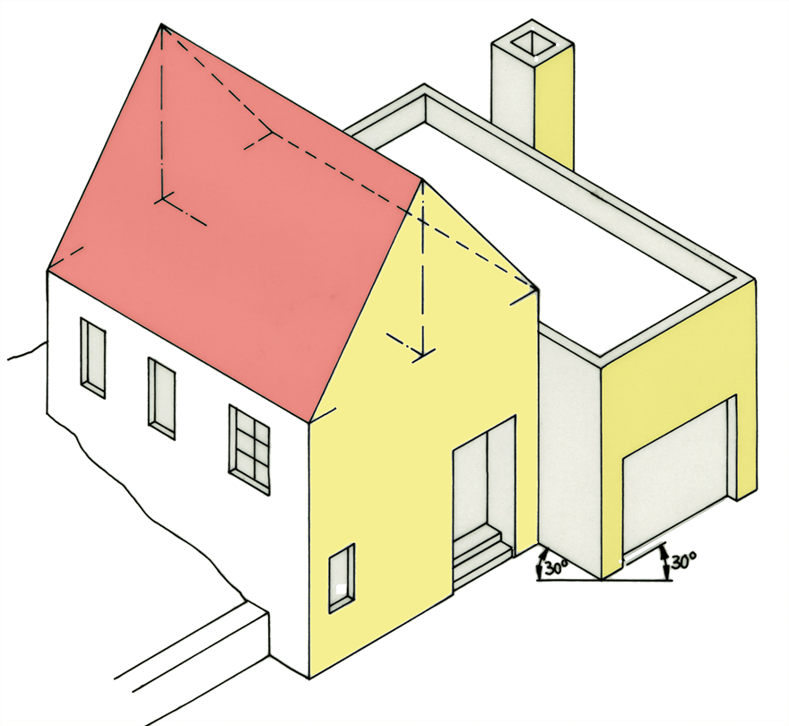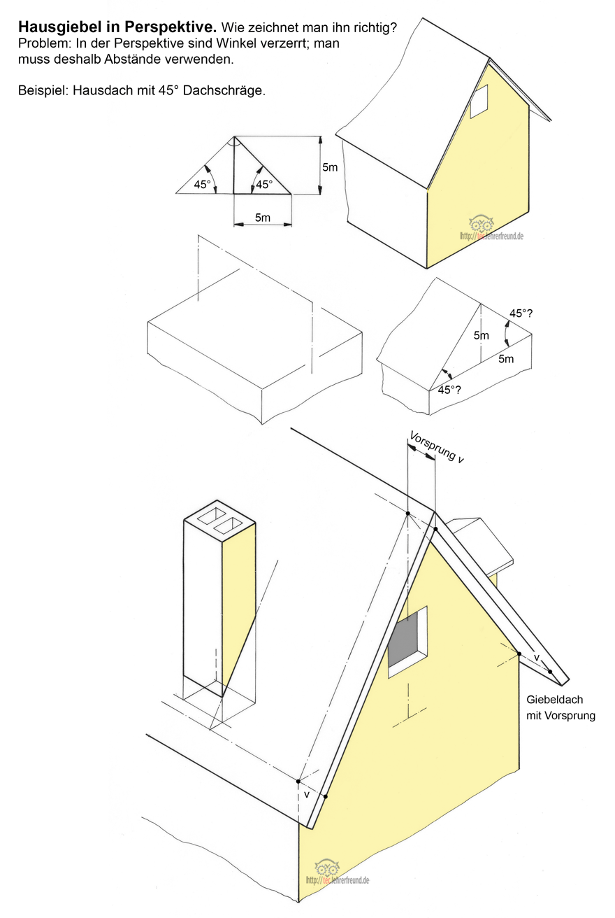 Grundsätzlich gilt: Sind für die Schräge eines Satteldachs Winkel angegeben - z. B. 45°, von der Horizontalen aus gemessen - so nützen sie dem Zeichner wenig, denn er kann sie in seiner Zeichnung leider nicht anwenden, weil die Winkel durch die Perspektive verzerrt werden. Der Zeichner muss ermitteln, welche Längen (Höhen) diese Winkel ergeben und muss dann mit diesen Längen zeichnen.