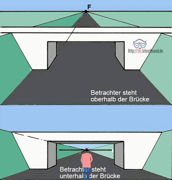 Nimmt der Betrachter eine höhere oder tiefere Position ein, dann verschiebt sich auch der Fluchtpunkt nach oben bzw. unten (Bild Straßenbrücke). In allen Fällen liegt der Fluchtpunkt auf der Augenhöhe des Betrachters.