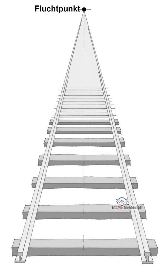 Betrachtet man ausgedehnte Objekte wie Häuserfronten, Alleen, Straßen, Flüsse usw. dann meint man, sie verjüngten sich nach hinten. »Nach hinten« heißt: Es sind nur die Linien gemeint, die sich vom Betrachter entfernen; in der Ferne scheinen sie in einem Punkt zusammenzulaufen, dem Fluchtpunkt. Beispiele für die Einfluchtpunkt-Perspektive.