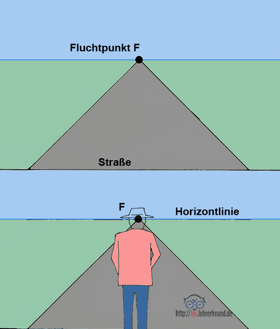 Betrachtet man ausgedehnte Objekte wie Häuserfronten, Alleen, Straßen, Flüsse usw. dann meint man, sie verjüngten sich nach hinten. »Nach hinten« heißt: Es sind nur die Linien gemeint, die sich vom Betrachter entfernen; in der Ferne scheinen sie in einem Punkt zusammenzulaufen, dem Fluchtpunkt. Beispiele für die Einfluchtpunkt-Perspektive.