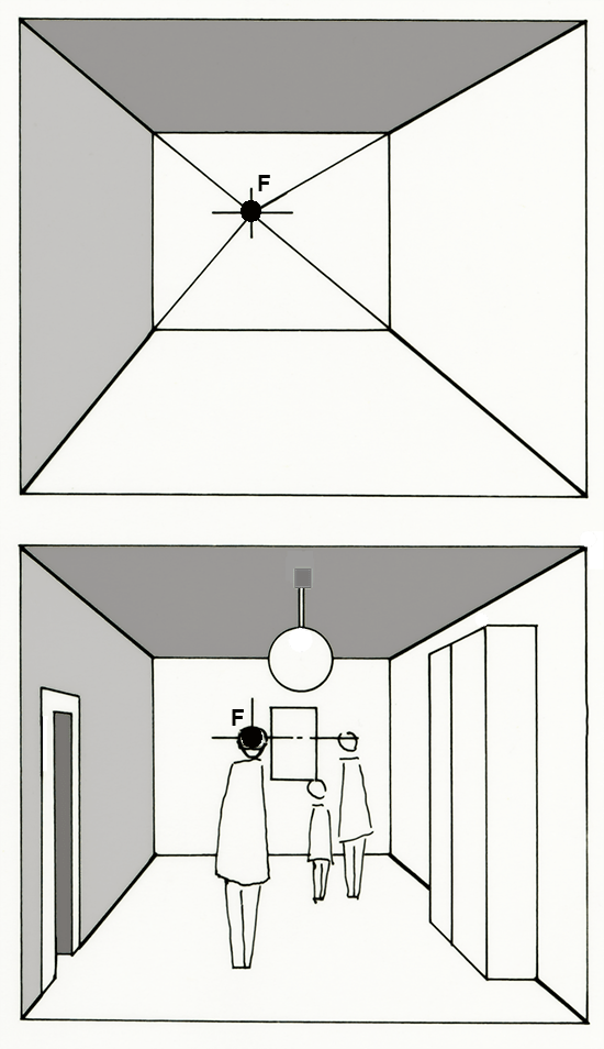 Bild Innenraum mit Menschen (unten): Ist der Fluchtpunkt festgelegt, gehen alle zur hinteren Wand laufenden Raumkanten auf den Fluchtpunkt zu. Die Augen etwa gleich großer Menschen liegen auf der Horizontlinie; die eines Kinds liegen tiefer.