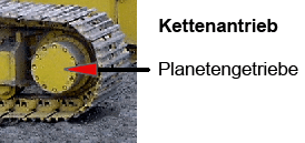 Einen Planetentrieb mit festem Übersetzungsverhältnis wollen wir am unten abgebildeten Getriebe, einem zweistufigen Planetengetriebe, studieren. Es handelt sich um den schematisch dargestellten Kettenantrieb eines Baggers, der extrem langsam laufen muss. Solche Getriebe besitzen, wenn sie mit drei Stufen ausgestattet sind, Übersetzungsverhältnisse mit i = 100 : 1 und höher. Der Antrieb kommt von einem mit etwa 2000 U/min drehenden Hydromotor. Der Abtrieb läuft über das mit dem Gehäuse verschraubte Kettenrad (= Turasrad). Das Hohlrad ist mit dem Unterwagen fest verbunden. Zwischen dem Motor und dem Kettenrad liegen die beiden Zahnradstufen. Das Sonnenrad der 1. Stufe treibt das Planetenrad , das sich im feststehenden Hohlrad abwälzt. Der kreisende Planetenträger überträgt seine Bewegung über den Ring auf das Sonnenrad der 2. Stufe. Deren Planetenträger gibt seine Bewegung schließlich an den Gehäusedeckel und das Kettenrad weiter.