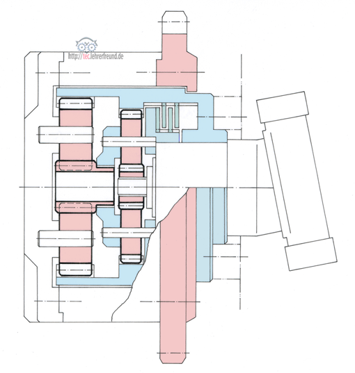 - Die Kraftübertragung wird von den Planetenrädern (meistens drei) gleichmäßig verteilt.