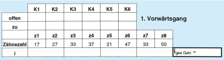 Das hier dargestellte Fahrgetriebe ermöglicht 4 Vorwärtsgänge. In der Übung geht es um den Kraftfluss im 1. Vorwärtsgang mit den Zahnrädern z1 bis z8. Welche Kupplungen sind geschlossen? Welche sind offen? Welche Übersetzungsverhältnisse ergeben sich daraus? Füllen Sie die Kupplungstabelle aus.
