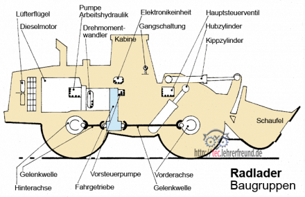 Aufbau: Das Hauptarbeitswerkzeug des Laders ist die Ladeschaufel. Sie ist am Hubarm (Hubrahmen) angebracht. Betätigt wird die Schaufel über die Hub- und Kippzylinder. Die Schaufelarbeitsbewegungen sind von der Ladekinematik abhängig; gebräuchlich sind die Z- und Parallelkinematik.