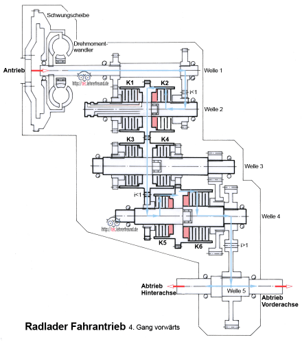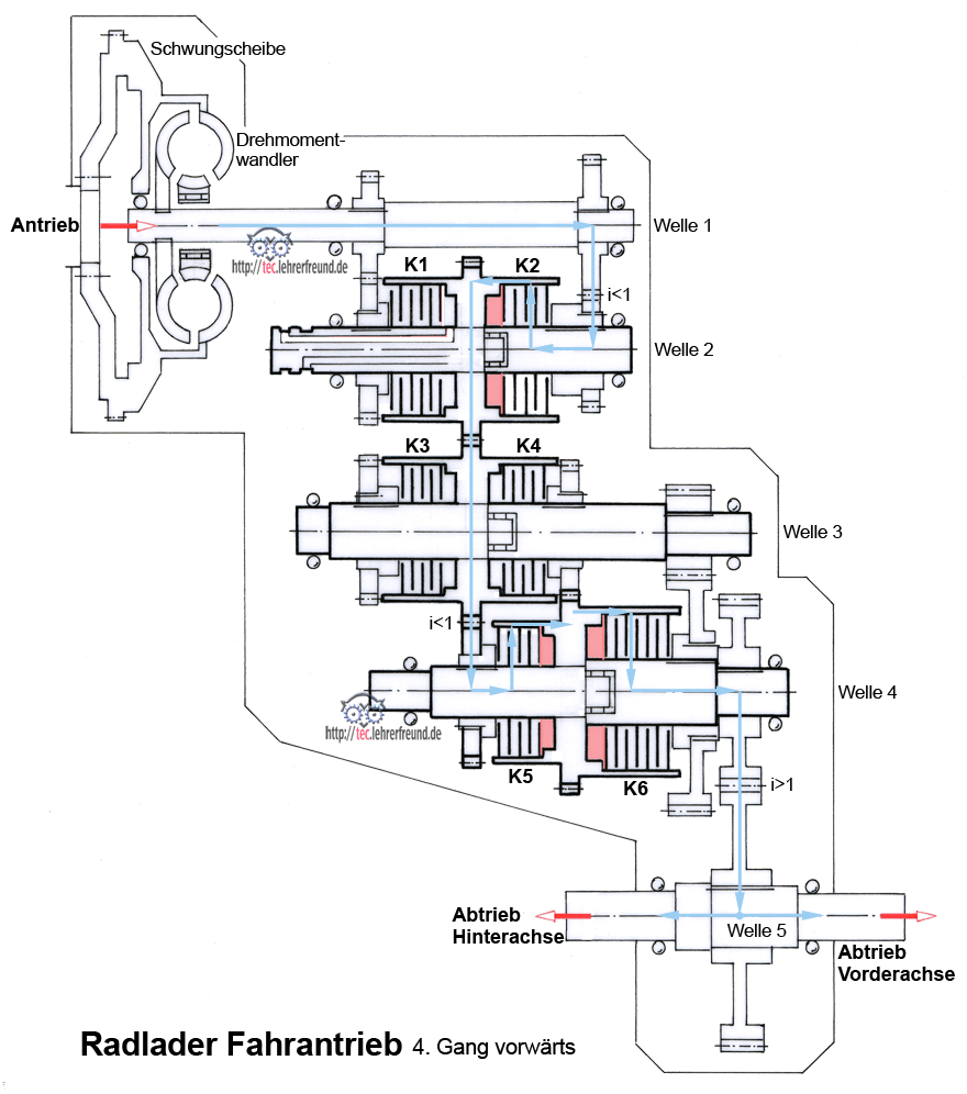 Das Schließen geschieht mit Drucköl, das über eine Bohrung in Welle 2 zur Kupplung geleitet wird. Sie erhält ihr Öl über eine Drehdurchführung, wie sie im Beitrag Bagger beschrieben ist. In den Wellen 3 und 4 sind diese Bohrungen nicht mehr eingezeichnet. Das Kupplungsschaltöl presst die Lamellenpakete K1 und K2 zusammen und gibt so das Drehmoment auf dem Weg der blauen Pfeile weiter. Am rechten Ende der Wellen 3 und 4 sind feste Zahnradübersetzungen eingebaut.