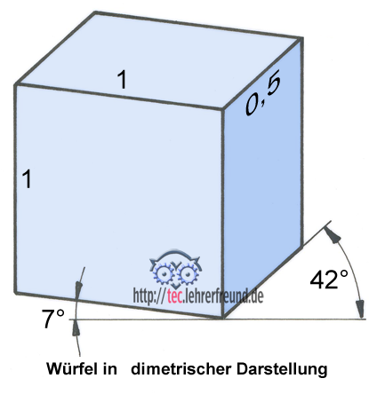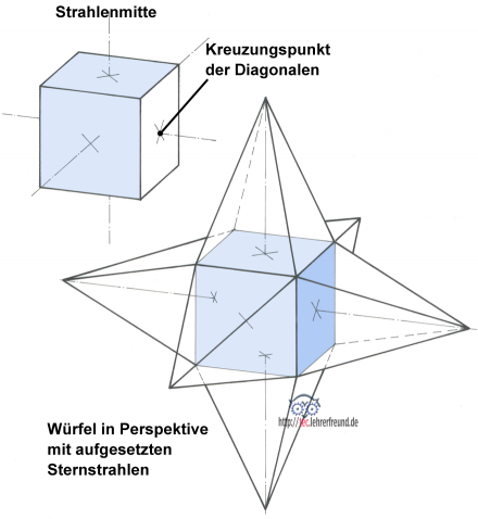 C: Wenn du meinst. Oben ist der Würfel, in dimetrischer Darstellung, falls du´s genau wissen willst. Seine Seiten stehen nach Norm im Verhältnis 1 : 1: 0,5. Für die Strahlenlängsachsen benötigen wir die Flächenmitten. Sie liegen im Kreuzungspunkt ihrer Diagonalen.