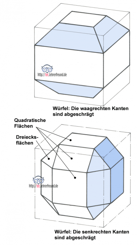 Ich habe die waagrechten Kanten so abgeschrägt, dass oben und unten quadratische Flächen übrig bleiben. Alle anderen Flächen besitzen eine Rechteck- oder Trapezform.