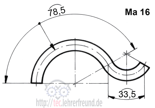 Bei Bogenmaßen wird das Halbkreissymbol vor die Maßzahl gesetzt (Ma 15.1). Beim Zeichnen von Hand kann man das Bogensymbol als Kreissegment über die Maßzahl setzen (Ma 15.2).