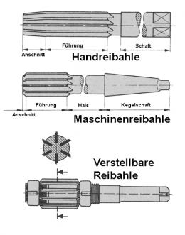 Reibahlen können gerade verzahnt oder gewendelt (schräg verzahnt) sein. Die Schrägverzahnung tut gute Dienste bei Bohrungen, die z. B. durch Passfedernuten unterbrochen sind. Dort hakt die gewendelte Reibahle nicht ein, weil die schräg laufenden Zähne die Nutenbreite überbrücken.