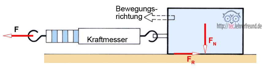 Die Haftreibungskraft ist größer als die Gleitreibungskraft. Die Reibungskraft FR wirkt gegen die Bewegungsrichtung (Bild). Sie hängt ab von