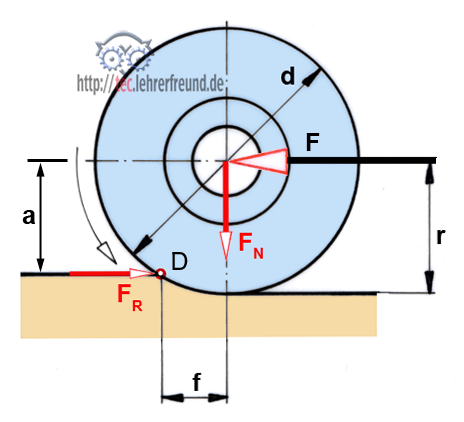 F hängt also ab von der Normalkraft FN, der Rollreibungszahl f und dem Radius r der Rolle. Je größer der Rollendurchmesser d (= 2 r), desto kleiner die Rollkraft F. Bei ungleicher Lastverteilung und mehreren Rollen, zum Beispiel bei Wälzlagern, wird anstelle der Rollreibungszahl f die Reibungszahl μ ermittelt. Die Reibungskraft FR  berechnet man aus