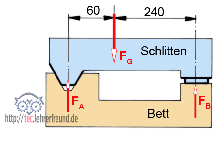 Fräsmaschinenschlitten. Das Schlittengewicht FG (= FN) = 360 daN verteilt sich ungleichmäßig auf die beiden Gleitbahnen. Die Reibzahl wird mit 0,25 angegeben.