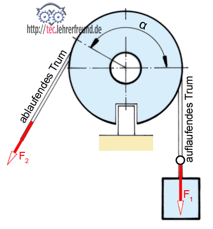 Seilreibung liegt vor, wenn um eine gegen Drehung gesicherte Scheibe ein vollkommen biegsames Zugmittel gelegt ist. Wegen der Reibung zwischen Zugmittel und Scheibe wird die Spannkraft F2 am ziehenden (ablaufenden) Trum größer als die Spannkraft F1 am gezogenen (auflaufenden) Trum: