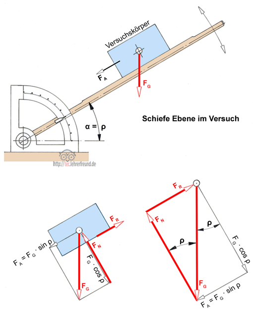 Die Neigung der schiefen Ebene entspricht dann dem Reibwinkel ρ = α
