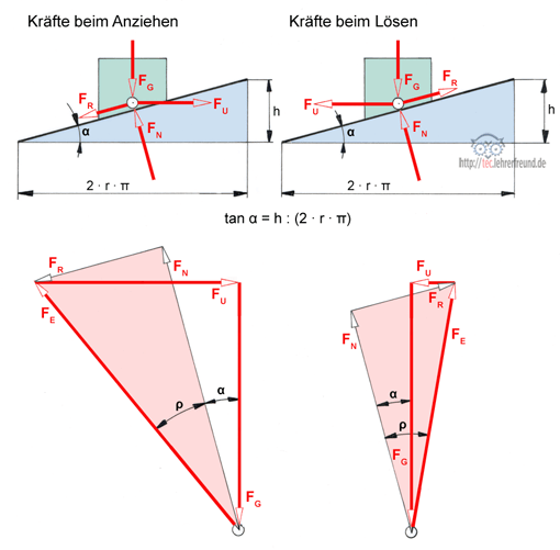 Die Bilder unten zeigen die Kraftecke für das Anziehen und Lösen der Schraubenverbindung. Beim Lösen der Schraubenverbindung haben Umfangskraft FU und Reibkraft FR umgekehrte Richtungen. Der Reibwinkel ρ ist hier größer als der Steigungswinkel α angenommen (ρ > α), so dass Selbsthemmung vorliegt.