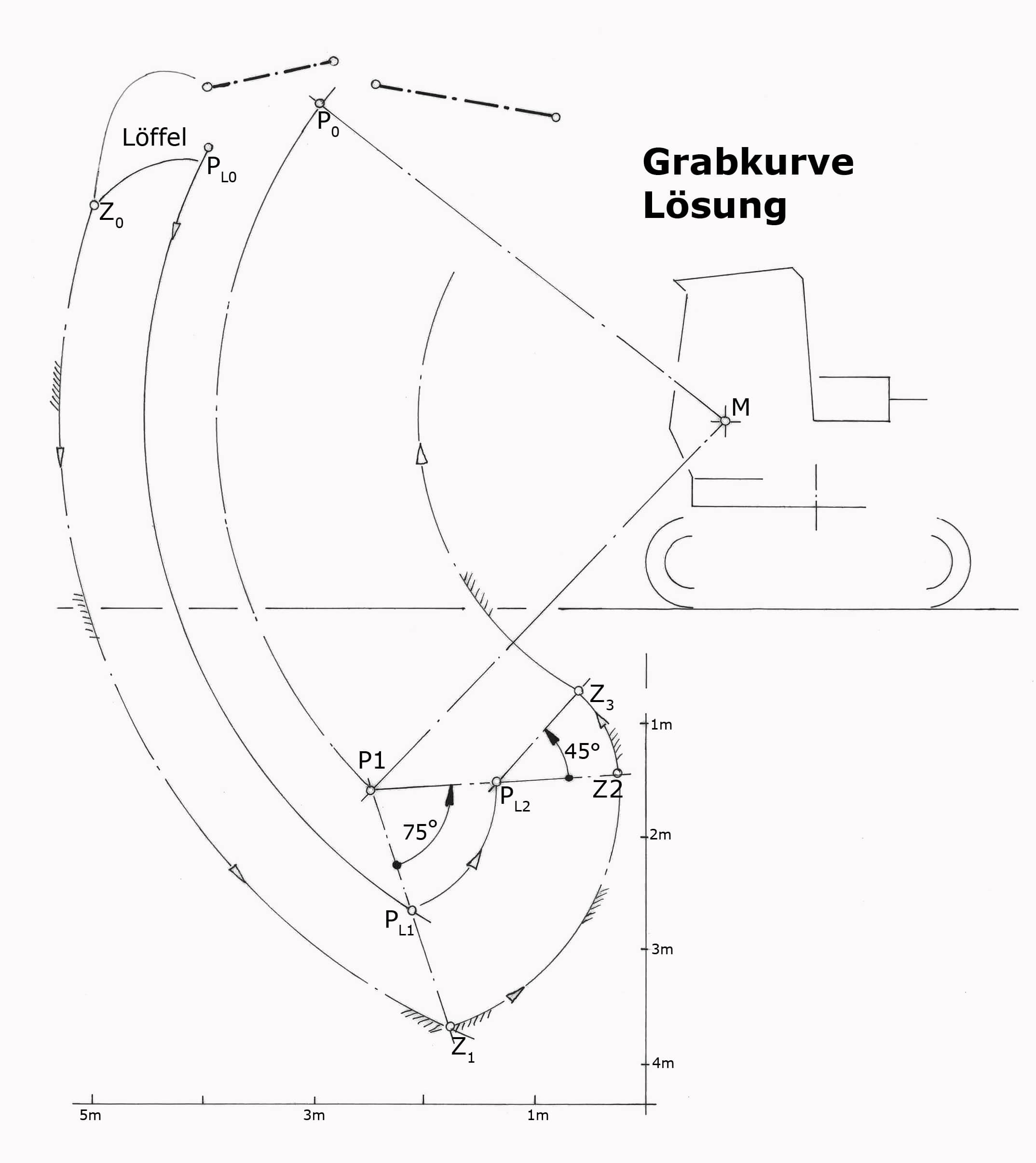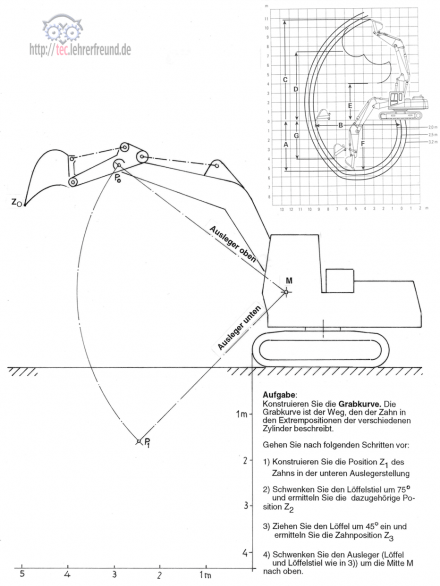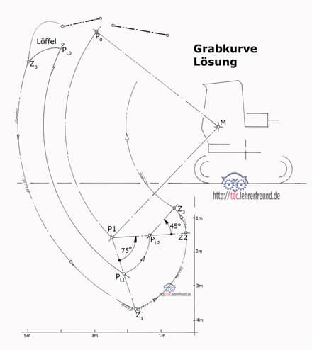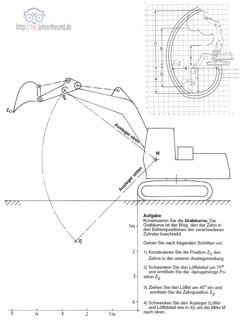 Beim Einsatz von Baggern, Radladern u. Ä. ist deren Motor- und hydraulische Leistung ein wichtiges Kriterium. Aber auch die Grabkinematik gibt Aufschluss über ihre Leistungsfähigkeit. Versuchen Sie, eine Grabkurve nach den Angaben des Arbeitsblatts zu konstruieren.