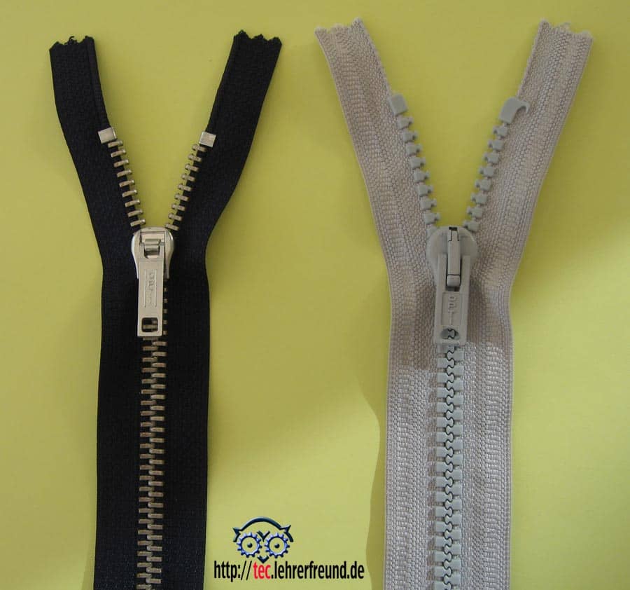 Bild: Links Reißverschluss mit Messing–, rechts mit Kunststoffzähnchen.