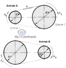 Betrachten Sie Antrieb A: Wenn der Riemen läuft, besitzt er zwangsläufig an jeder Stelle dieselbe Geschwindigkeit v. Die Riemengeschwindigkeit v ist also auf Scheibe 1 gleich groß wie auf Scheibe 2: