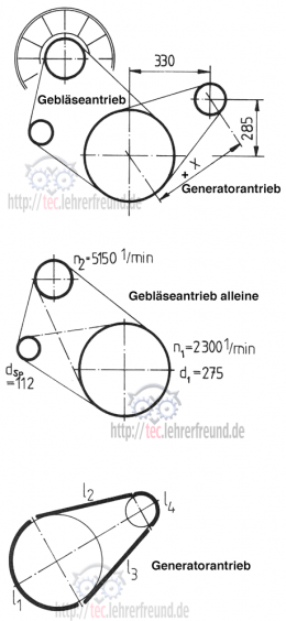 Riementrieb im Motor (Gebläseantrieb, Generatorantrieb)Wir sehen uns ein an einem Motor ausgeführtes Riementrieb-System an. Der Antrieb erfolgt von der Kurbelwelle aus; die untere große Scheibe ist also Nummer 1. Von der Kurbelwellenscheibe, die zwei Rillen besitzt, geht ein Riemen zum Kühlluftgebläse und einer zum Generator. Die technischen Angaben des Antriebs finden Sie in den Bildern. Darin sind die drei Antriebsstränge voneinander getrennt gezeichnet.